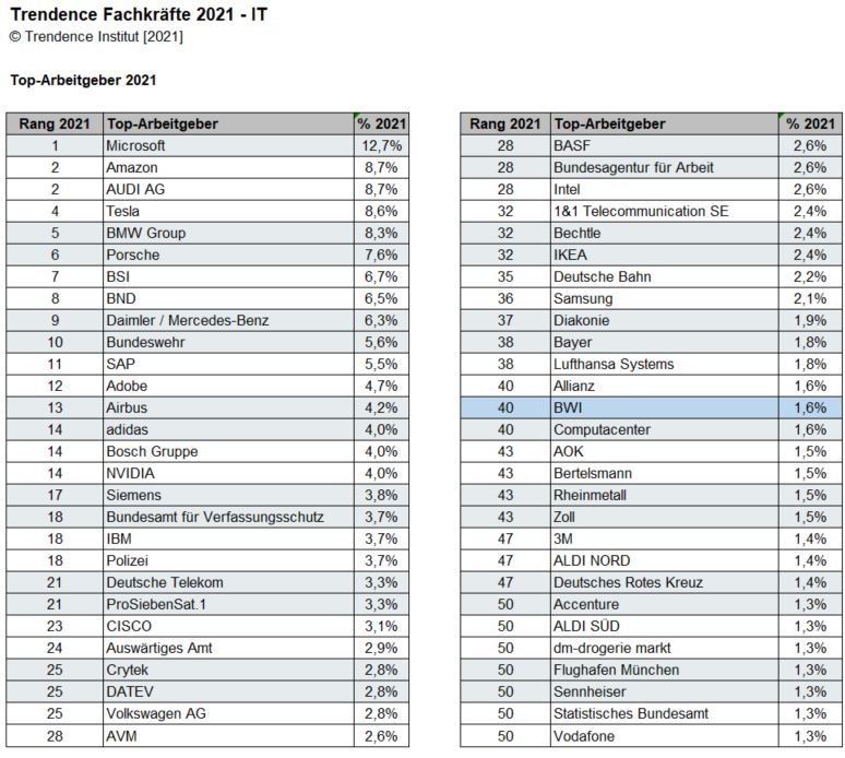 Trendence-Ranking: BWI erstmals unter Top 50-Arbeitgebern in der IT